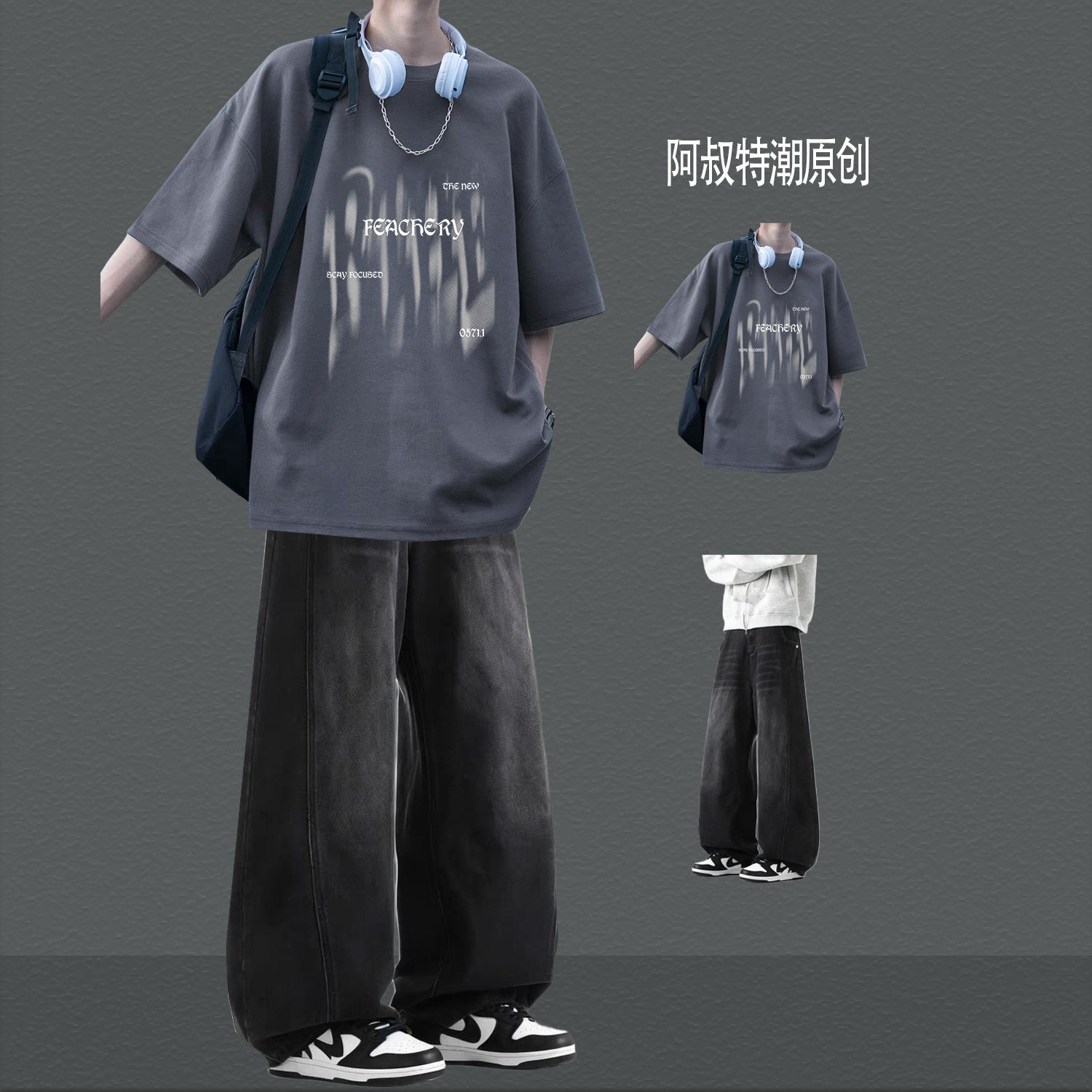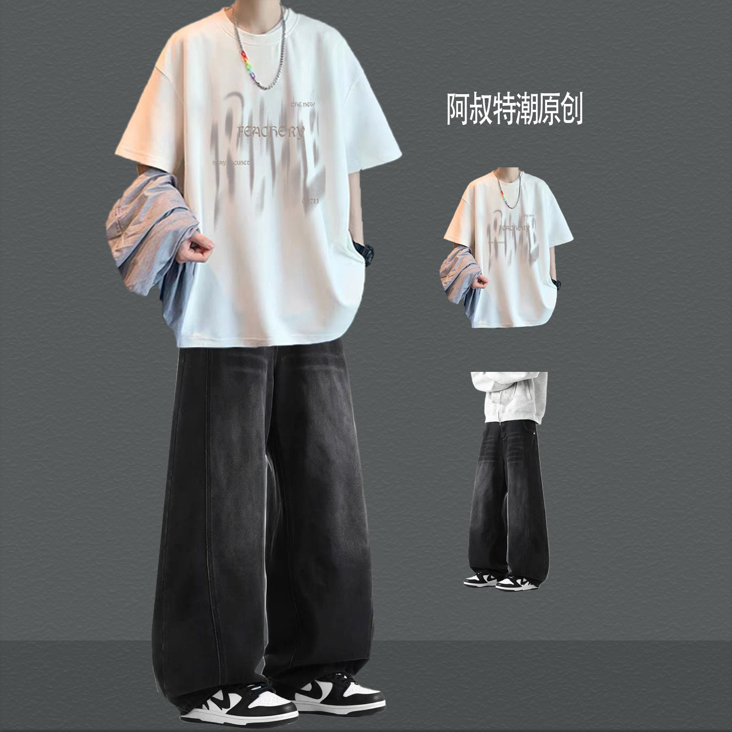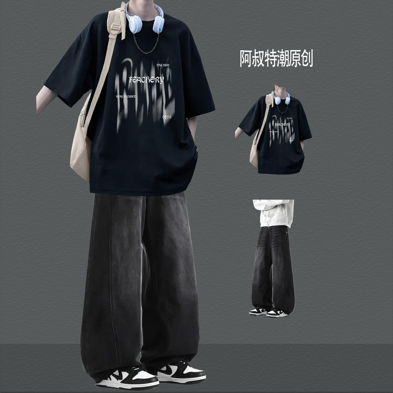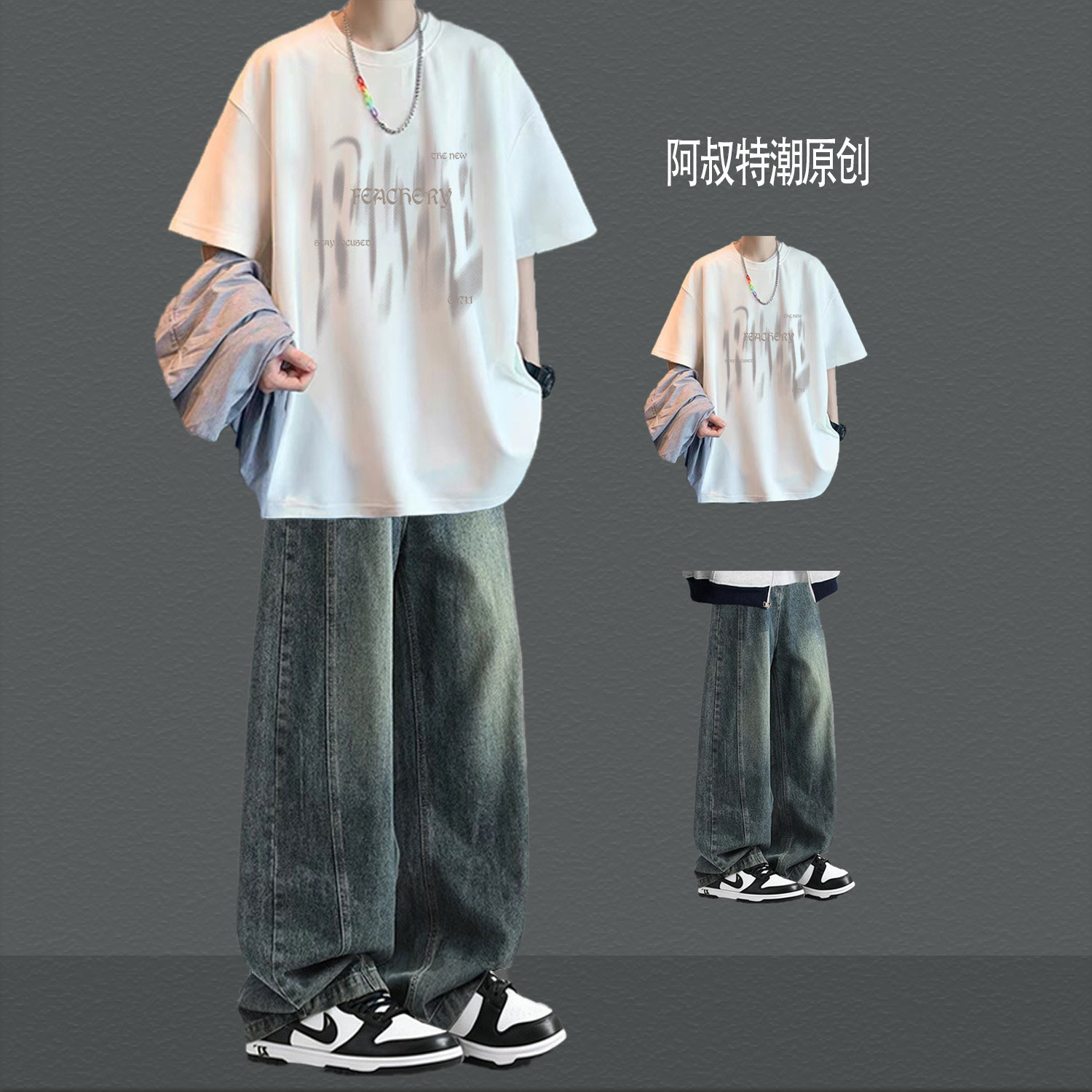 潮流重磅短袖T恤男生套装春夏大学生痞帅气穿搭韩版日常显高一套