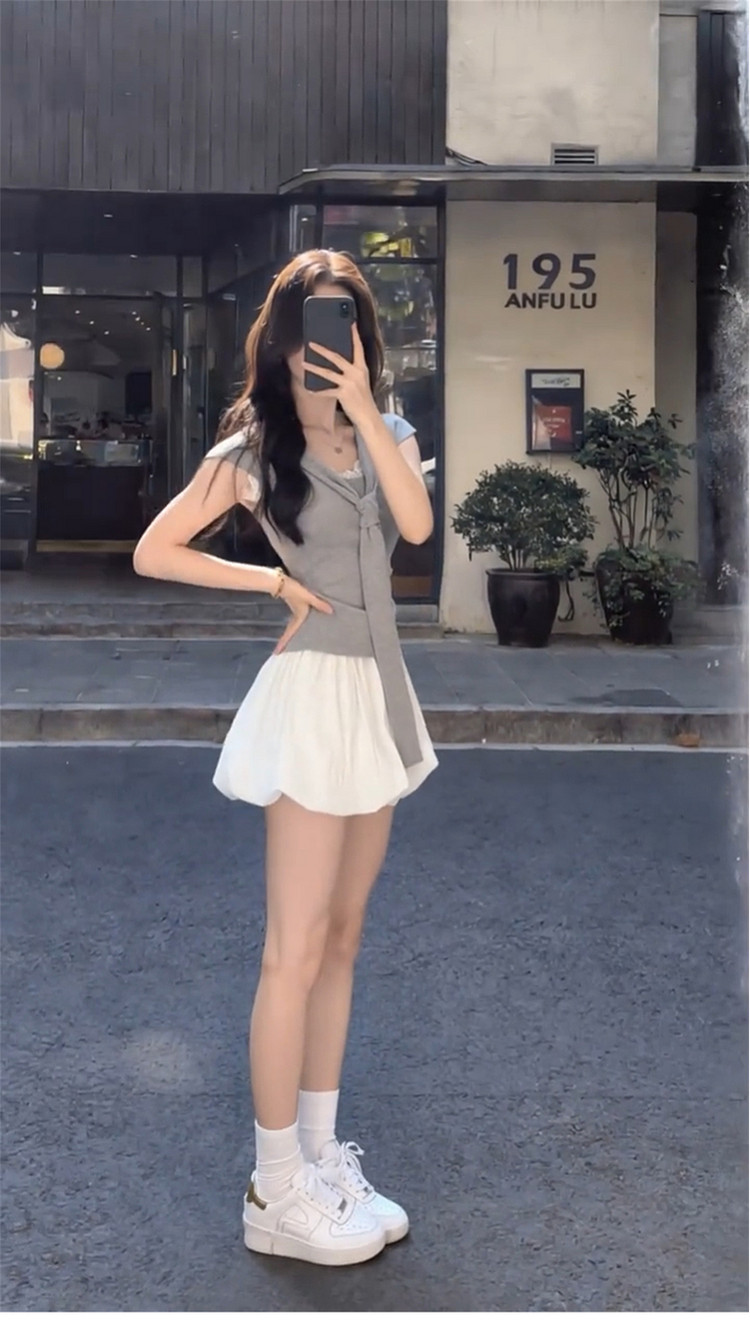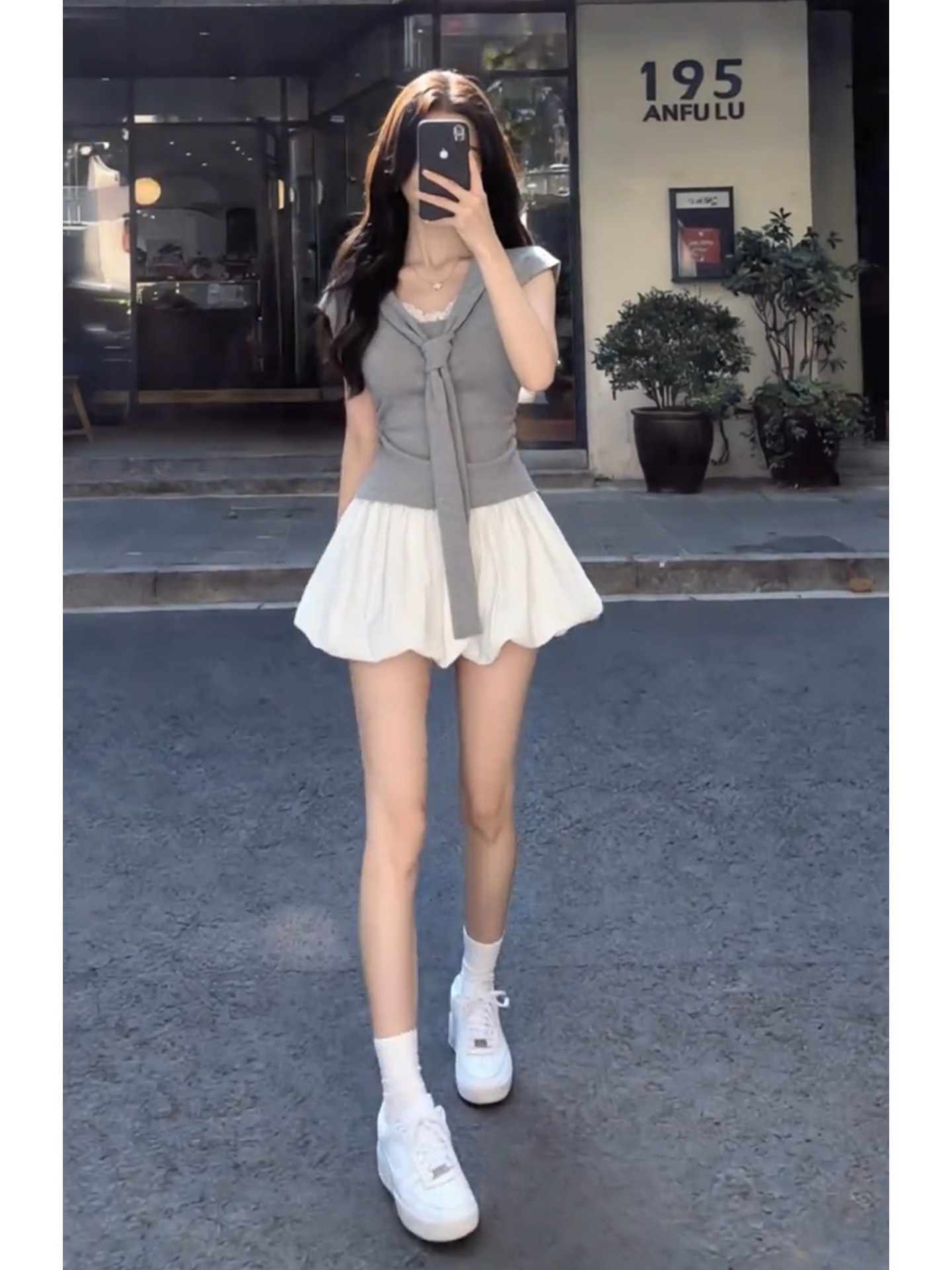 早春小个子短袖连衣裙子女夏2026新款miu系穿搭白色花苞短裙套装