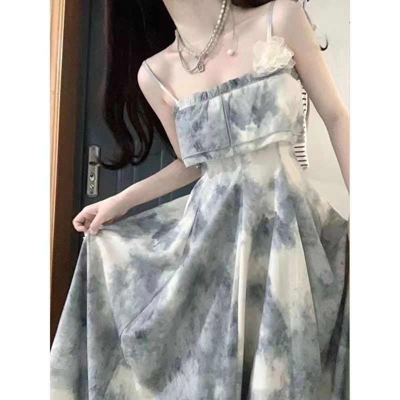 温柔风水墨晕染裹胸裙套装女夏季薄款防晒开衫茶歇法式吊带连衣裙