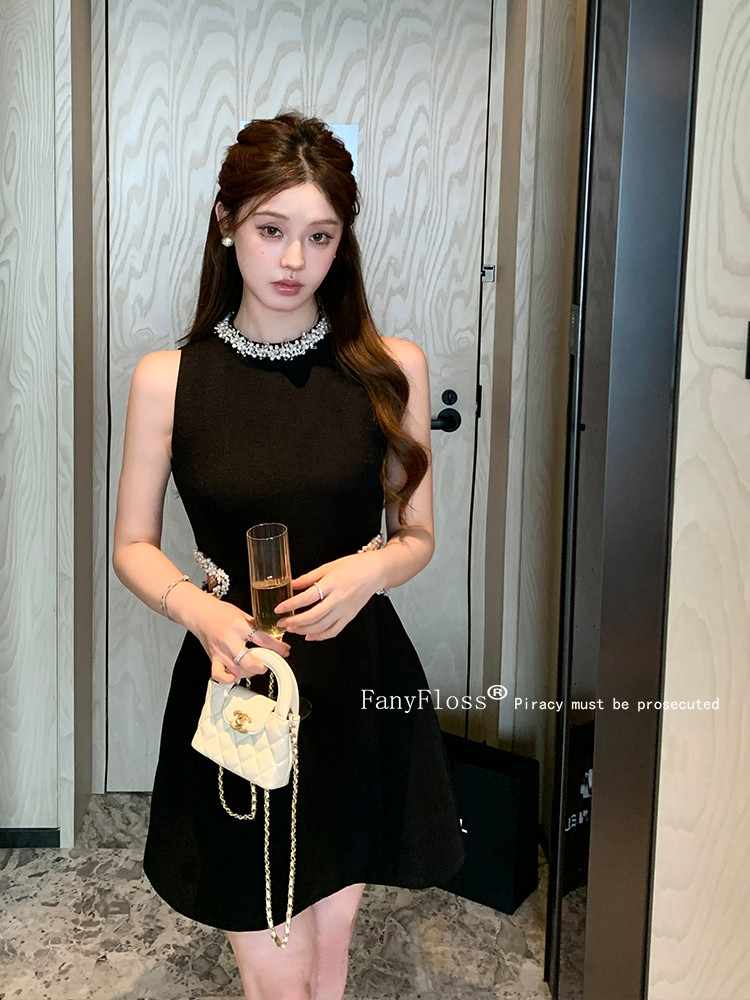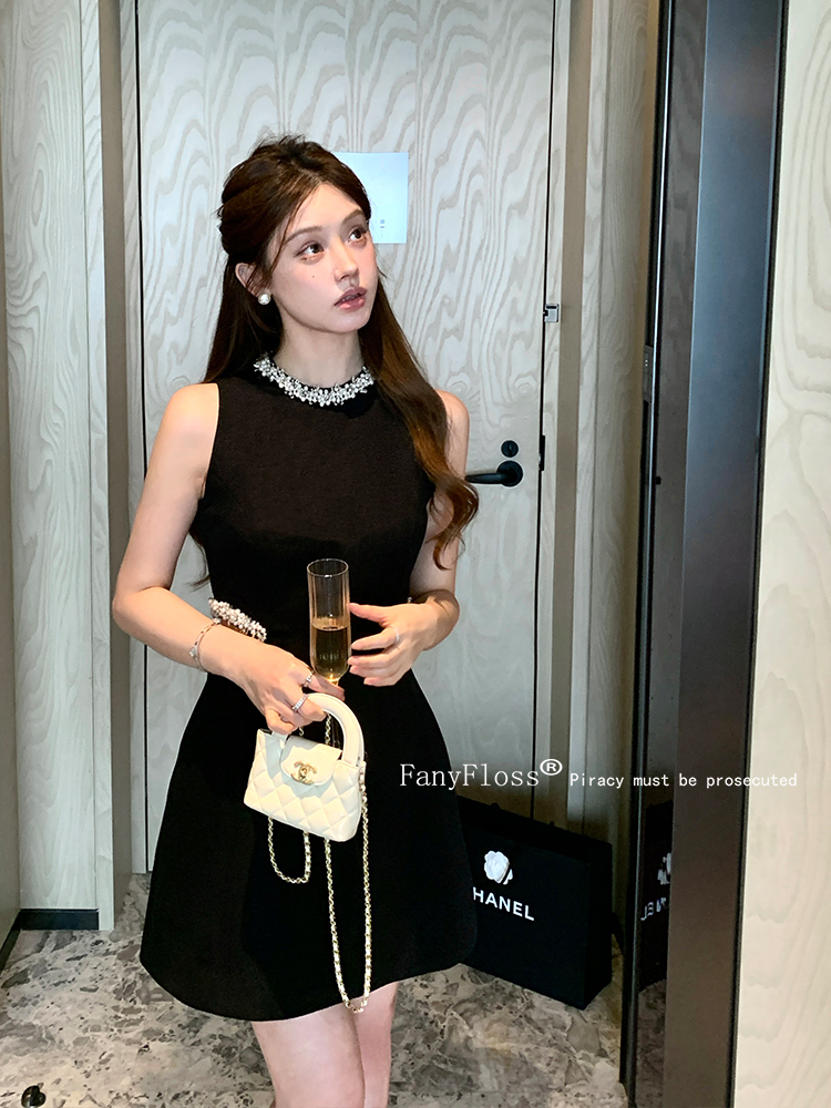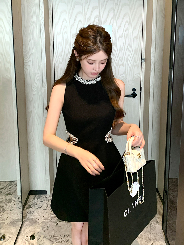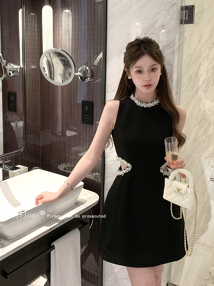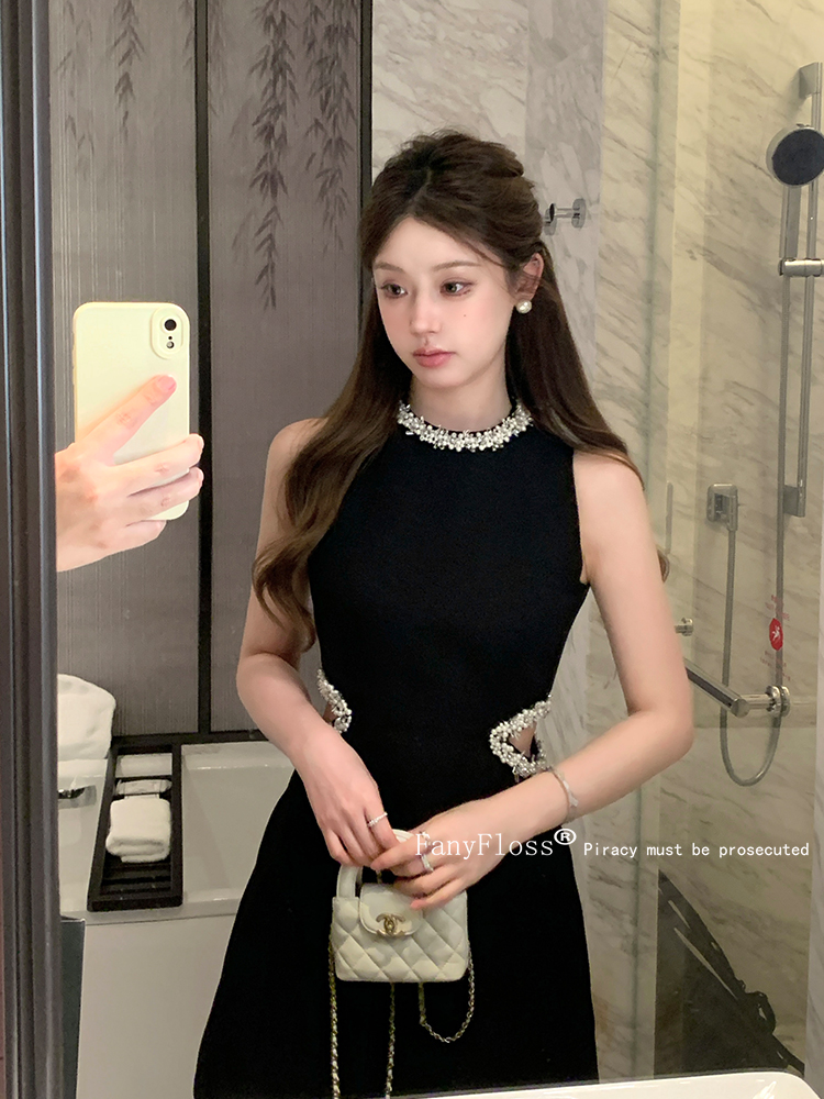 FanyFloss轻奢镶钻露腰镂空连衣裙女重工无袖闪钻收腰宴会小黑裙