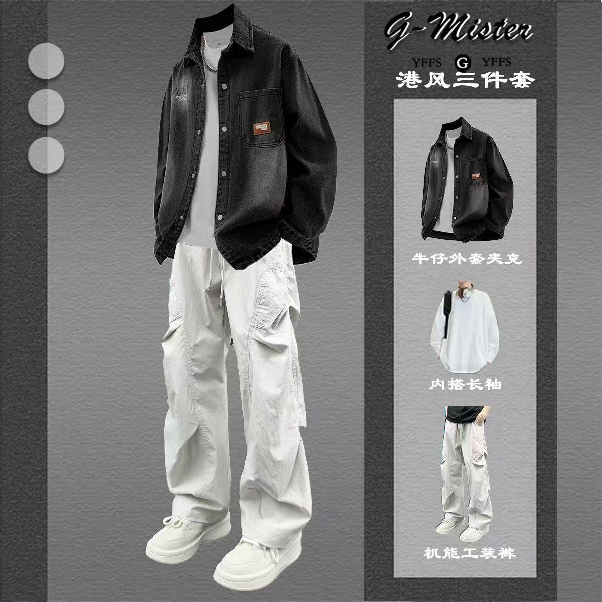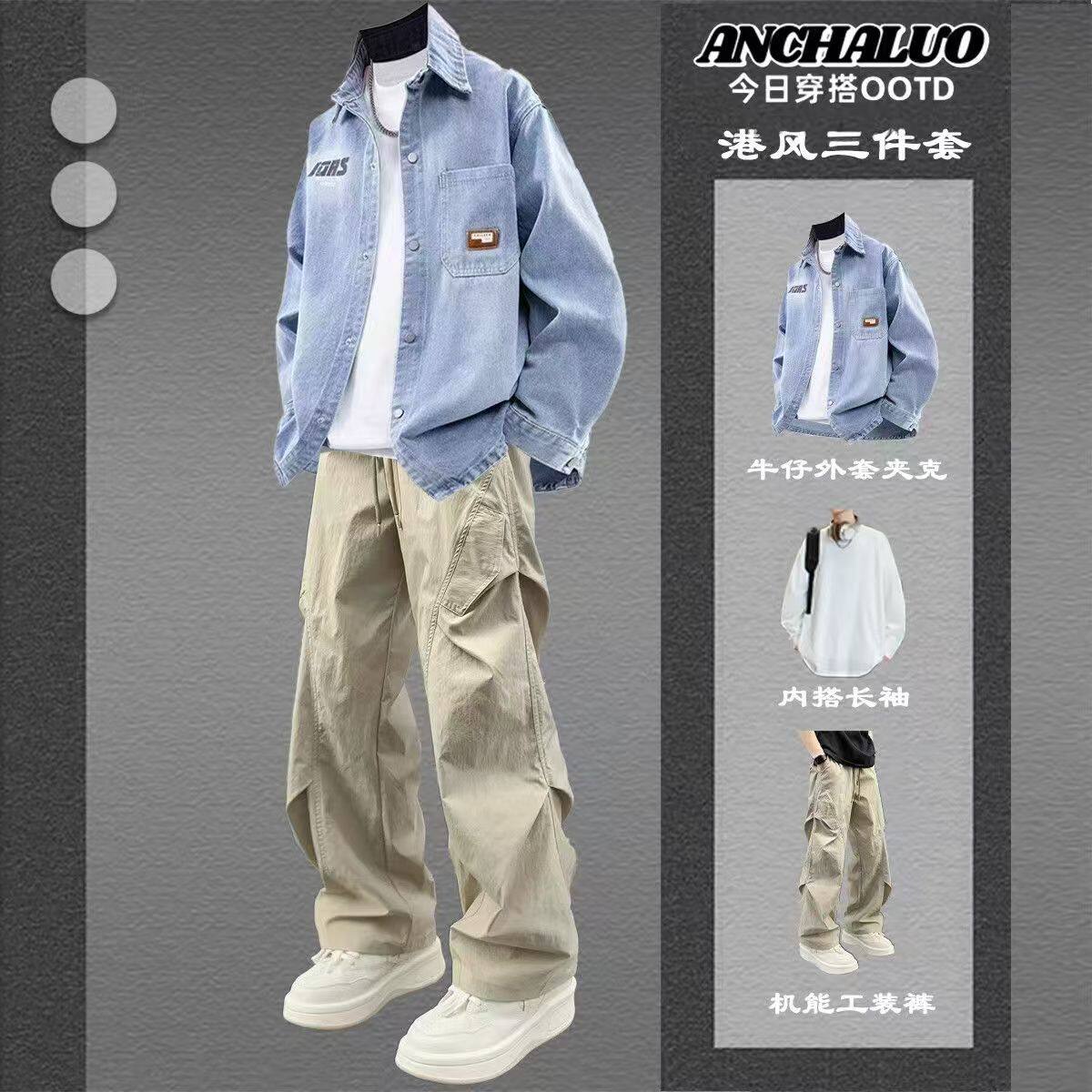 春季新款牛仔衬衫外套男夹克男士套装男生帅气搭配青少年衣服男装
